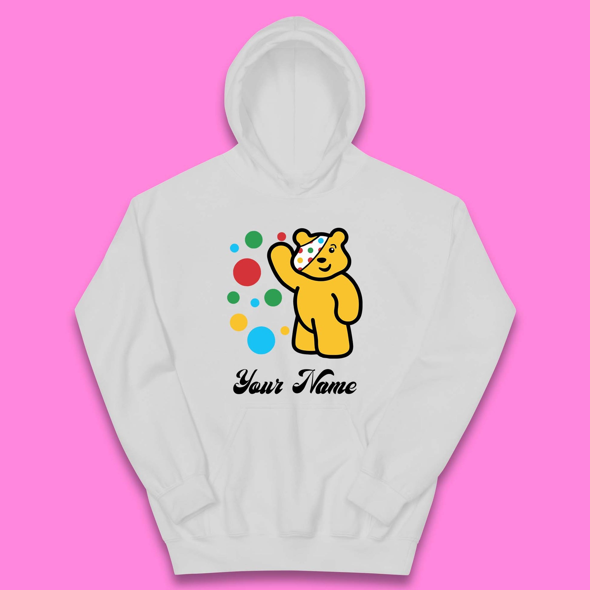 Personalised Spotty Pudsey Bear Hand Waving Dotty Spot Your Name Fundraising Spotty Bear Spotty Day Kids Hoodie