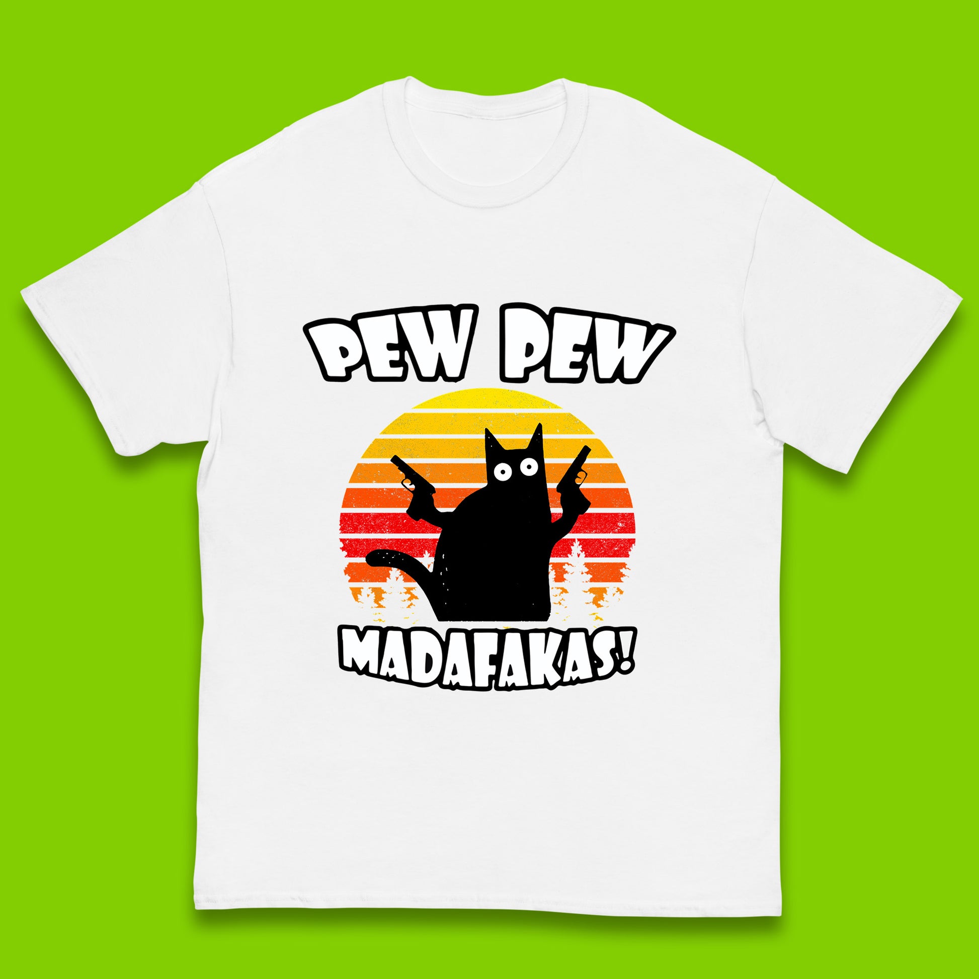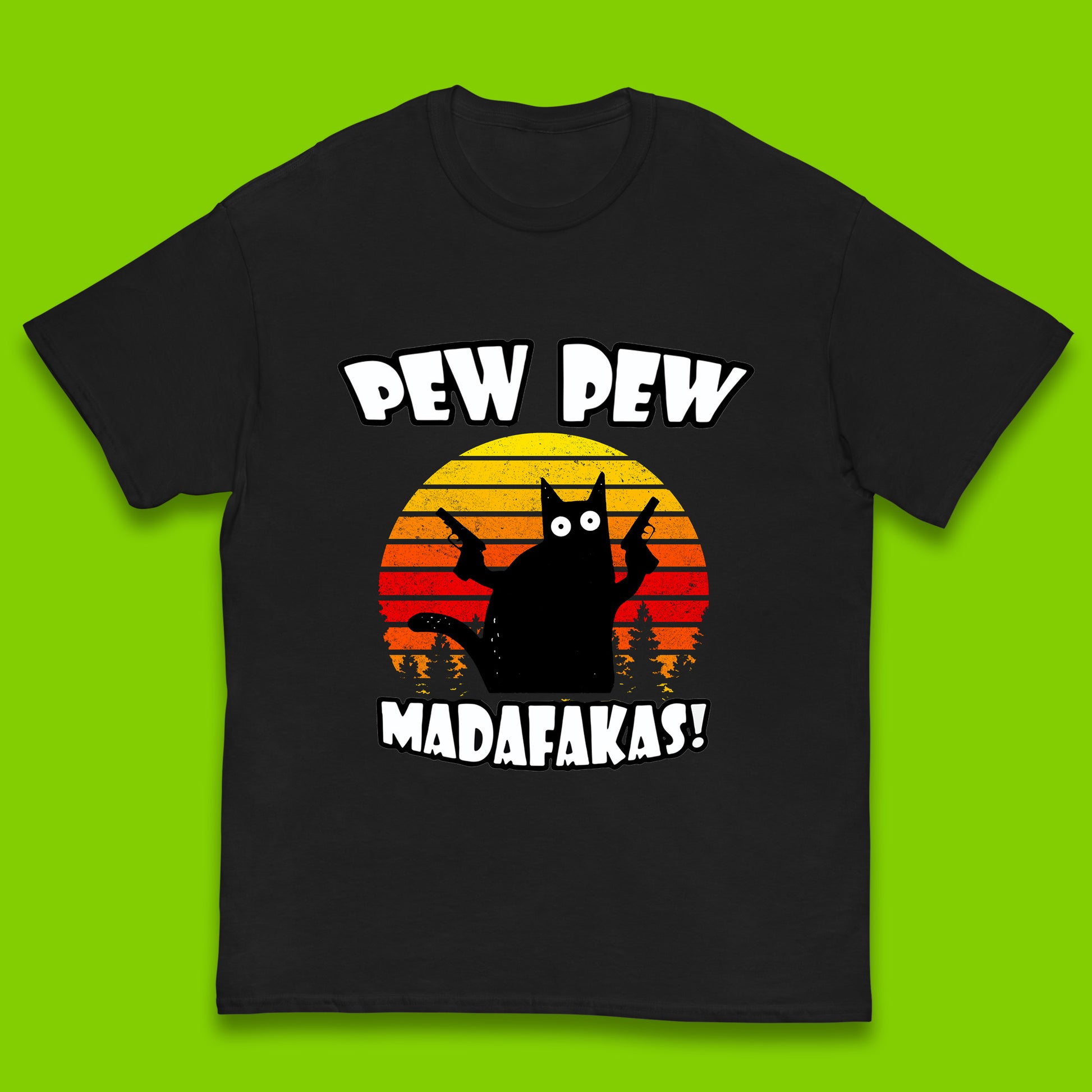Pew Pew Madafakas Funny Joke Retro Vintage Cat Gun Pistol Kitty Pew Pew Cat Meme Kids T Shirt