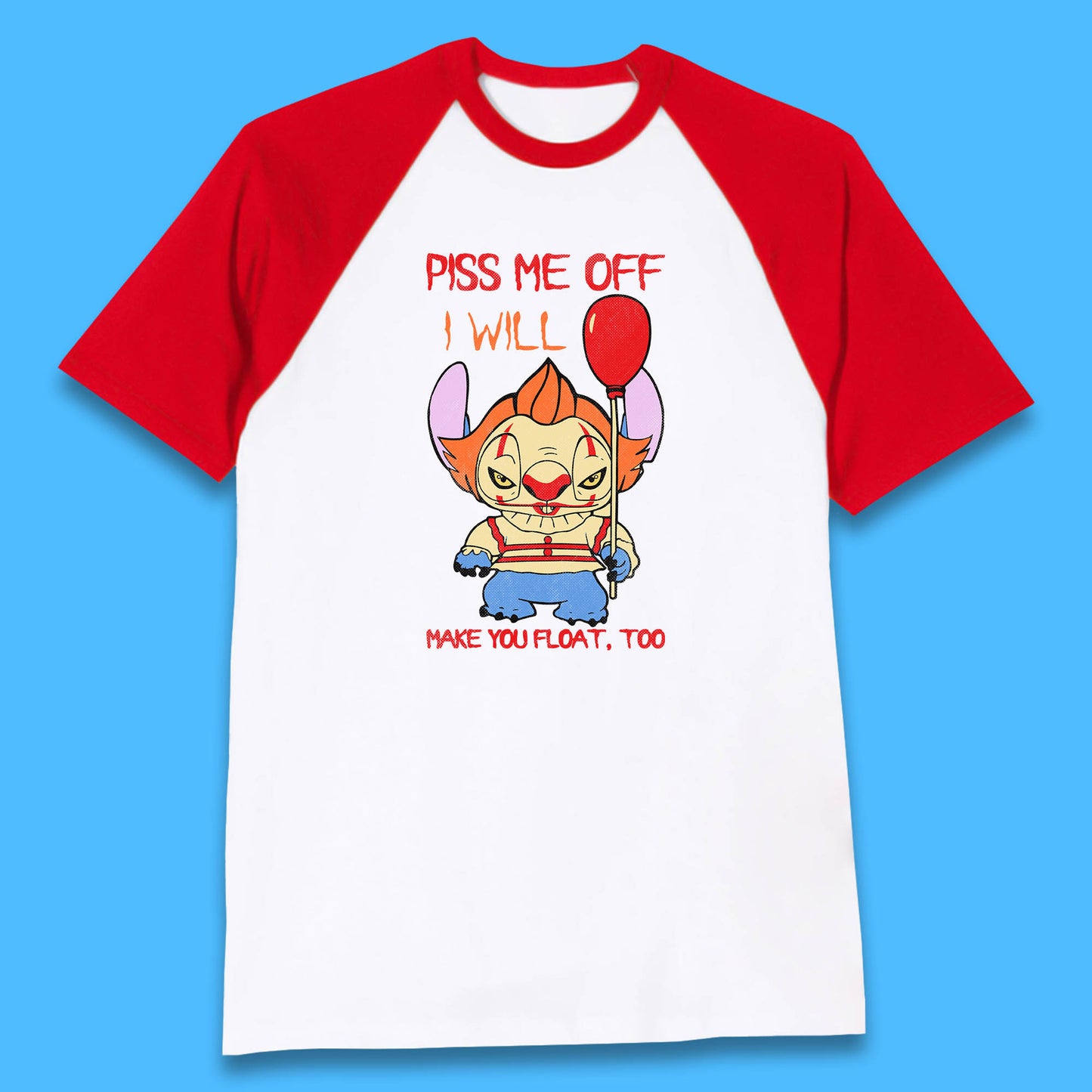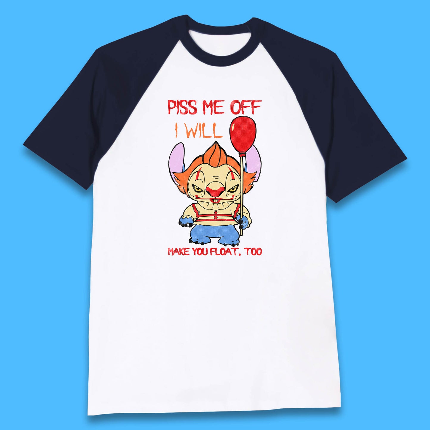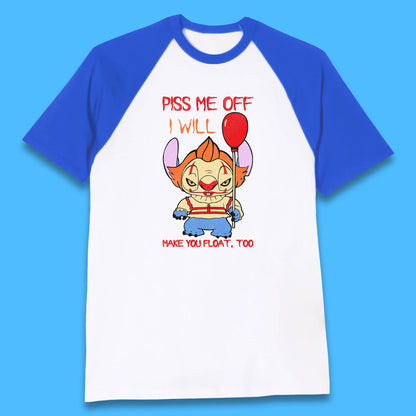 Piss Me Off I Will Make You Float, Too Halloween IT Pennywise Clown & Disney Stitch Movie Mashup Parody Baseball T Shirt
