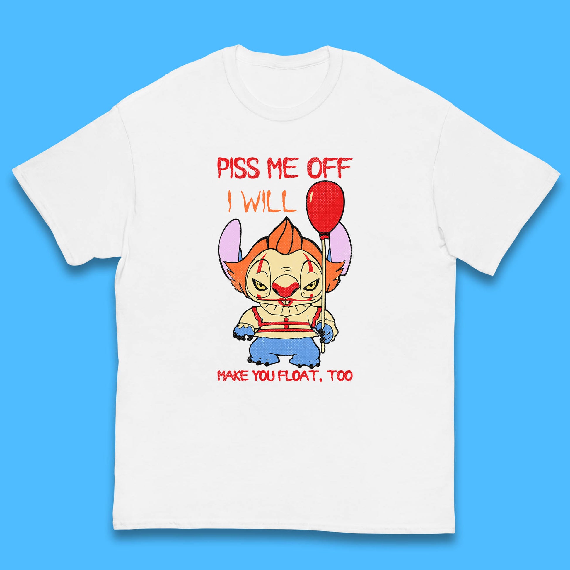 Piss Me Off I Will Make You Float, Too Halloween IT Pennywise Clown & Disney Stitch Movie Mashup Parody Kids T Shirt