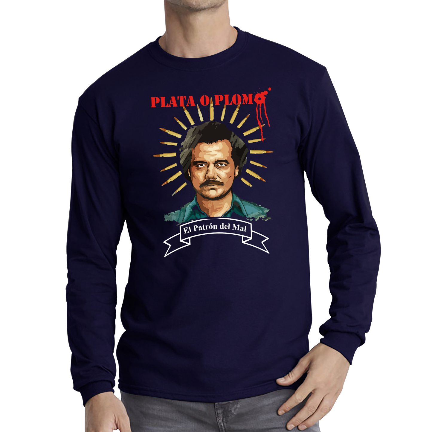 Make a bold statement with our "Plata O Plomo" Pablo Escobar Long Sleeve T-Shirt. This tee combines a striking graphic with comfort, making it perfect for showcasing your admiration for the infamous figure while providing extra warmth.
