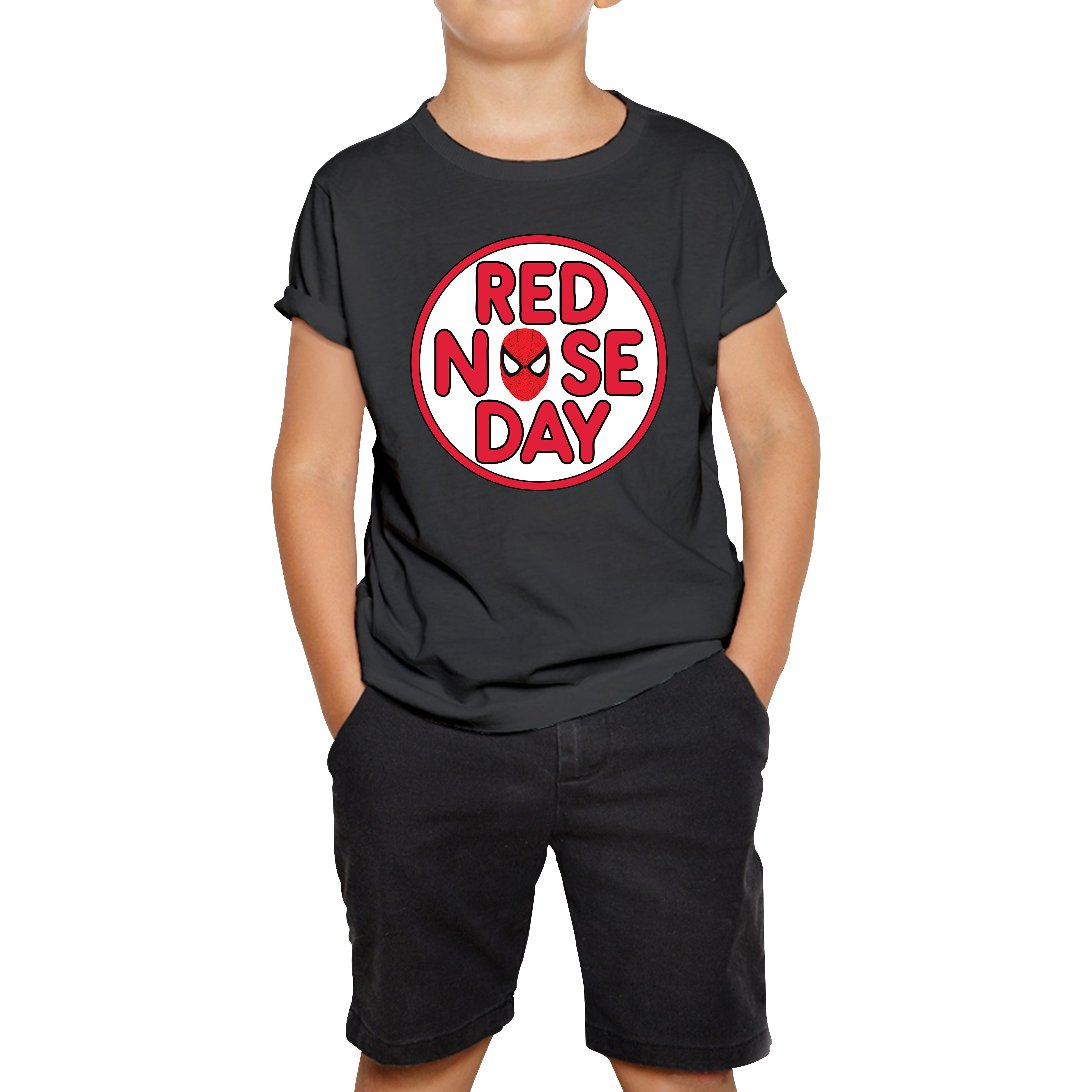 Celebrate Red Nose Day with a splash of superhero excitement in our "Spiderman Face Red Nose Day" kids t-shirt. This playful and comfortable tee combines the iconic Spiderman face with the cheerful spirit of Red Nose Day, making it a perfect choice for young fans and supporters.