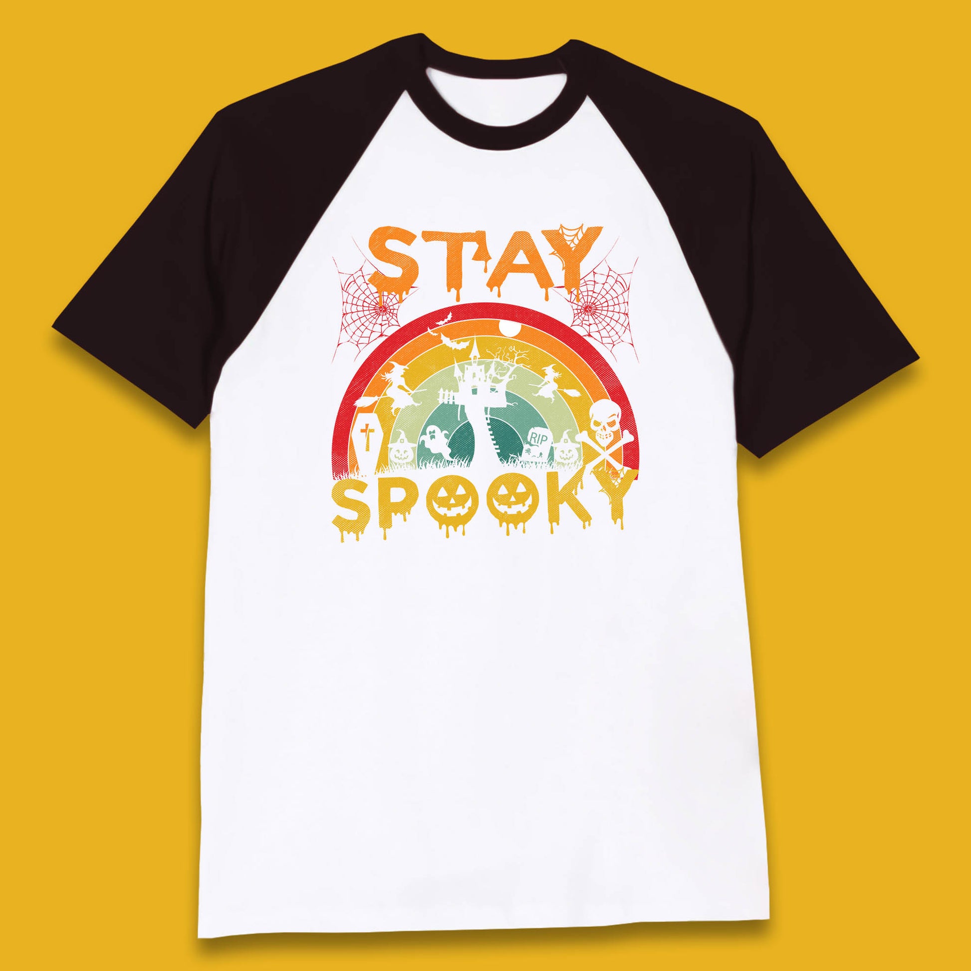 Stay Spooky Vintage Halloween Hunted House Dark Night Full Moon And Flying Bats Baseball T Shirt