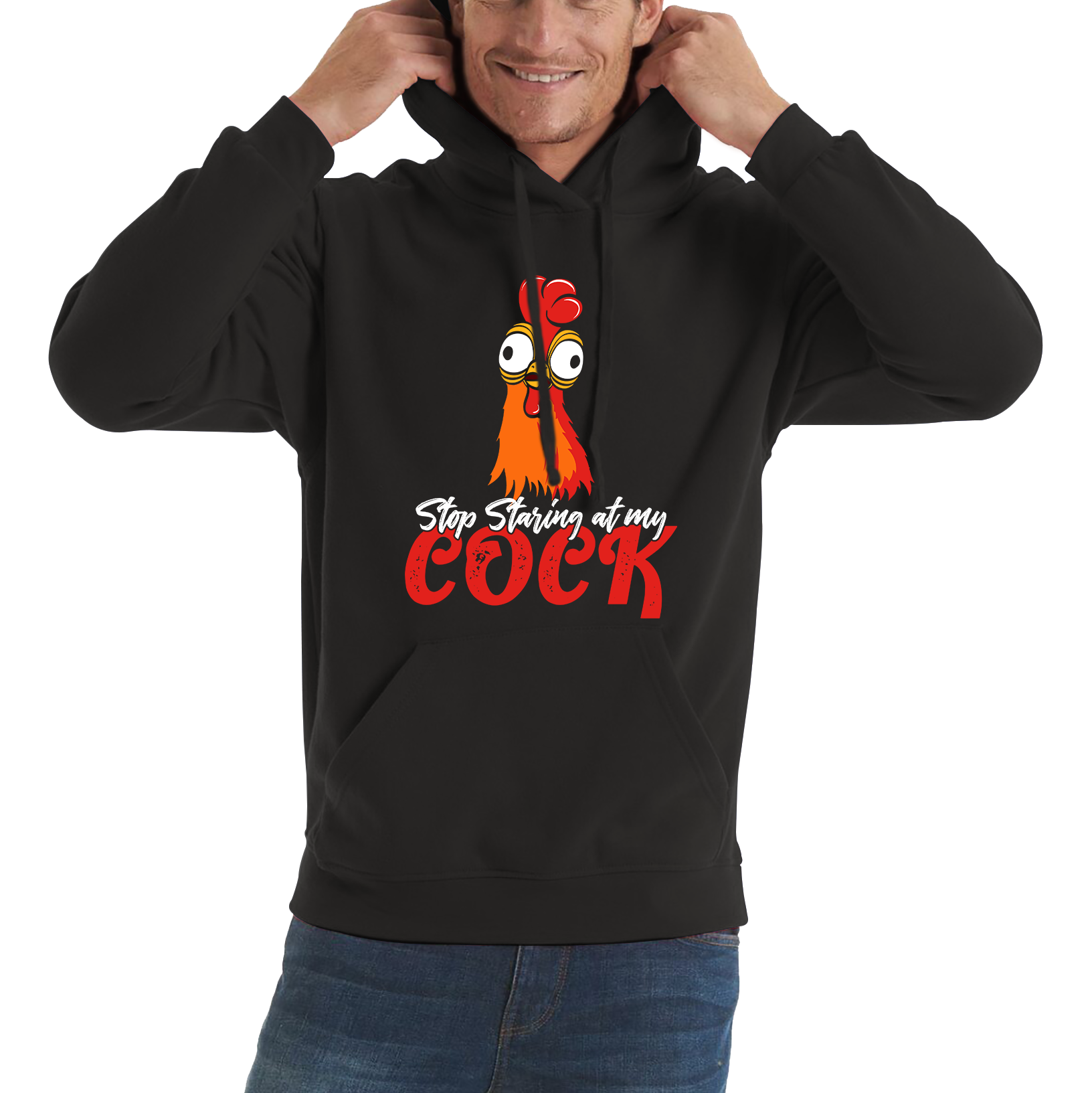 Add a touch of humor to your wardrobe with the Stop Staring At My Cock unisex hoodie. Featuring a playful and cheeky graphic, this hoodie is sure to turn heads and spark conversations. Made from a soft cotton-poly blend, it provides warmth and comfort for any casual occasion. The unisex design ensures a relaxed and flattering fit for everyone, while the adjustable drawstring hood and front pouch pocket add both practicality and style.