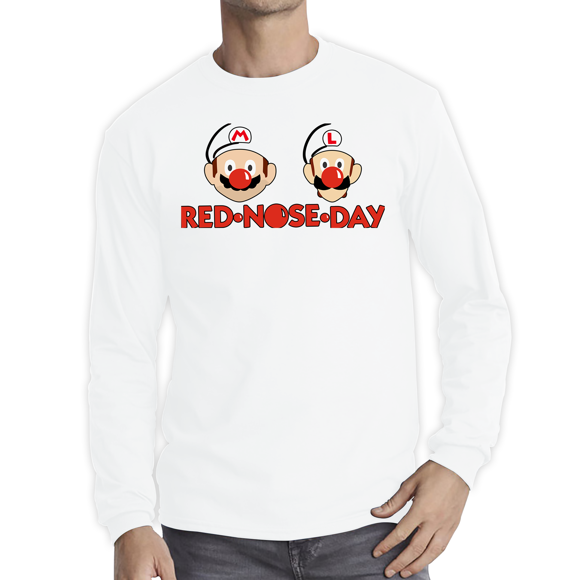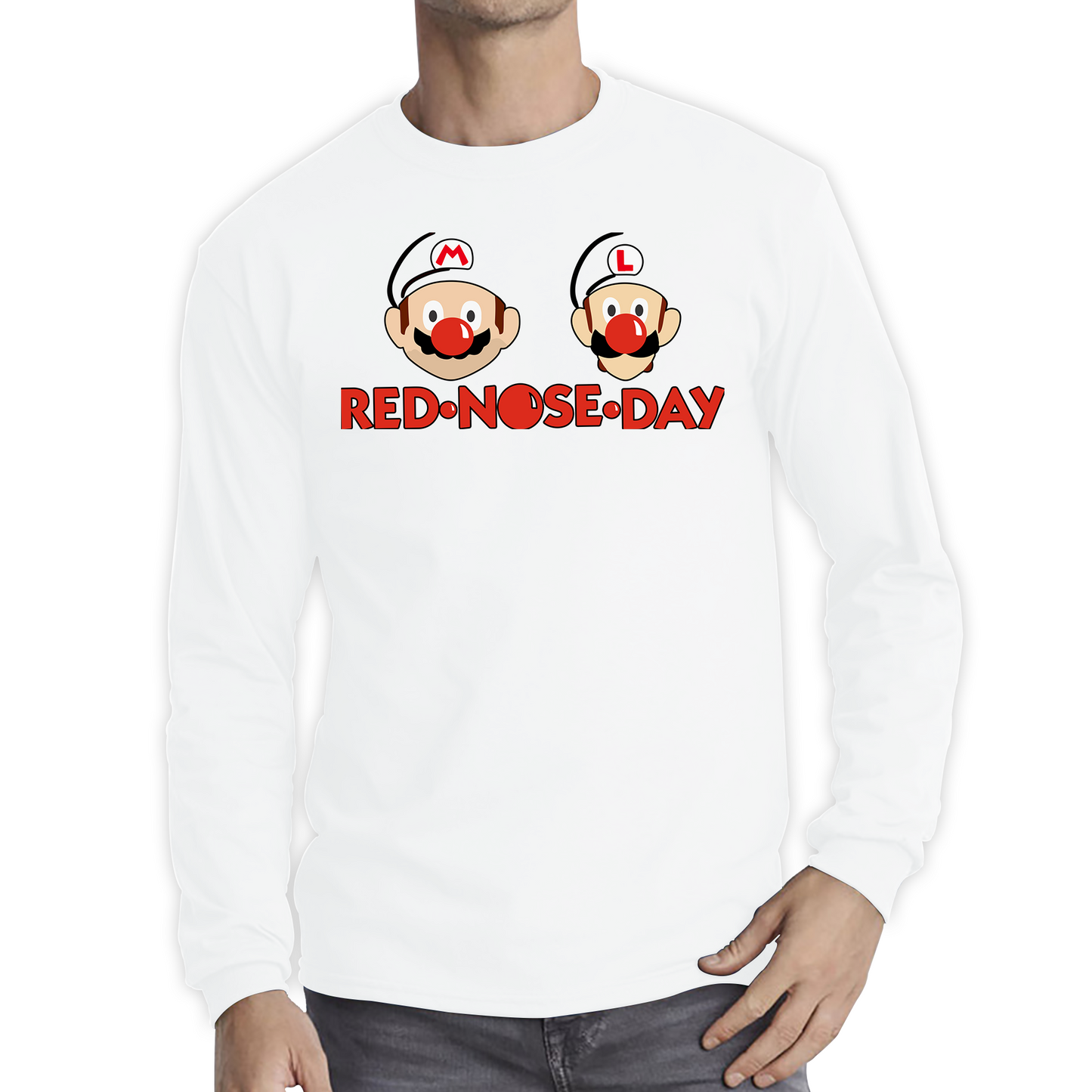 Get ready to power up your Red Nose Day celebrations with the "Super Mario Bros Red Nose Day" unisex long sleeve T-shirt. Featuring an exciting design inspired by the beloved Super Mario franchise, this T-shirt showcases Mario, Luigi, and other iconic characters sporting playful red noses. It’s a fun and engaging way to support Red Nose Day while celebrating your favorite video game heroes.
