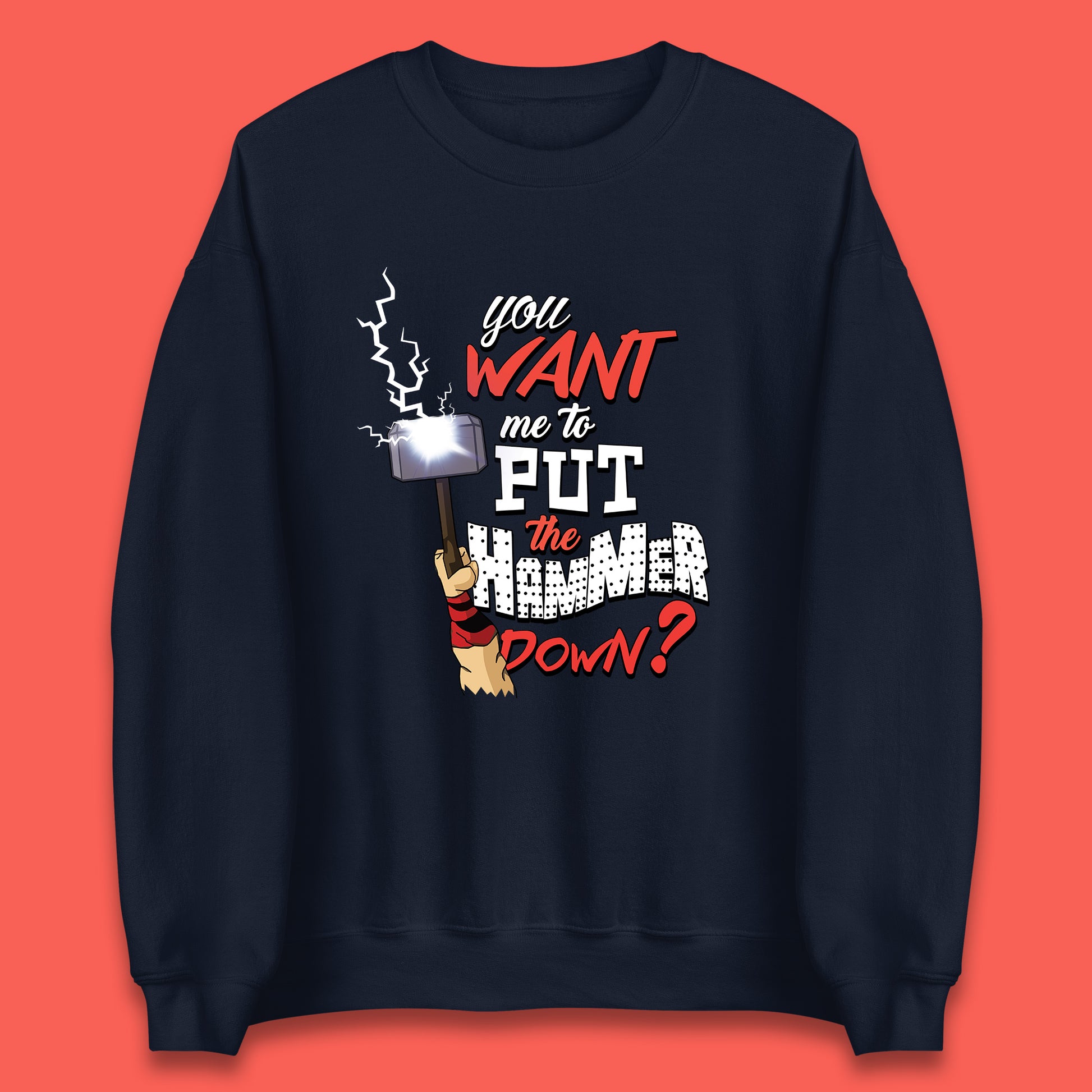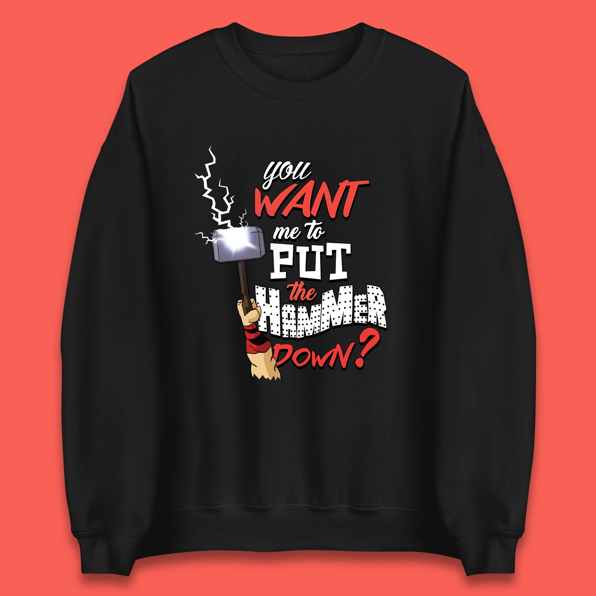 Thor Quote You Want Me To Put The Hammer Down? Thor Hammer Marvel Avengers Superheros Movie Character Unisex Sweatshirt