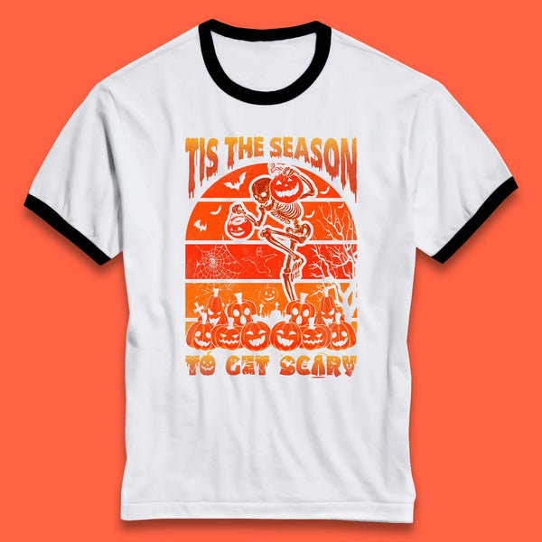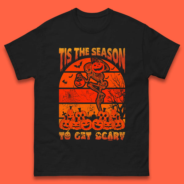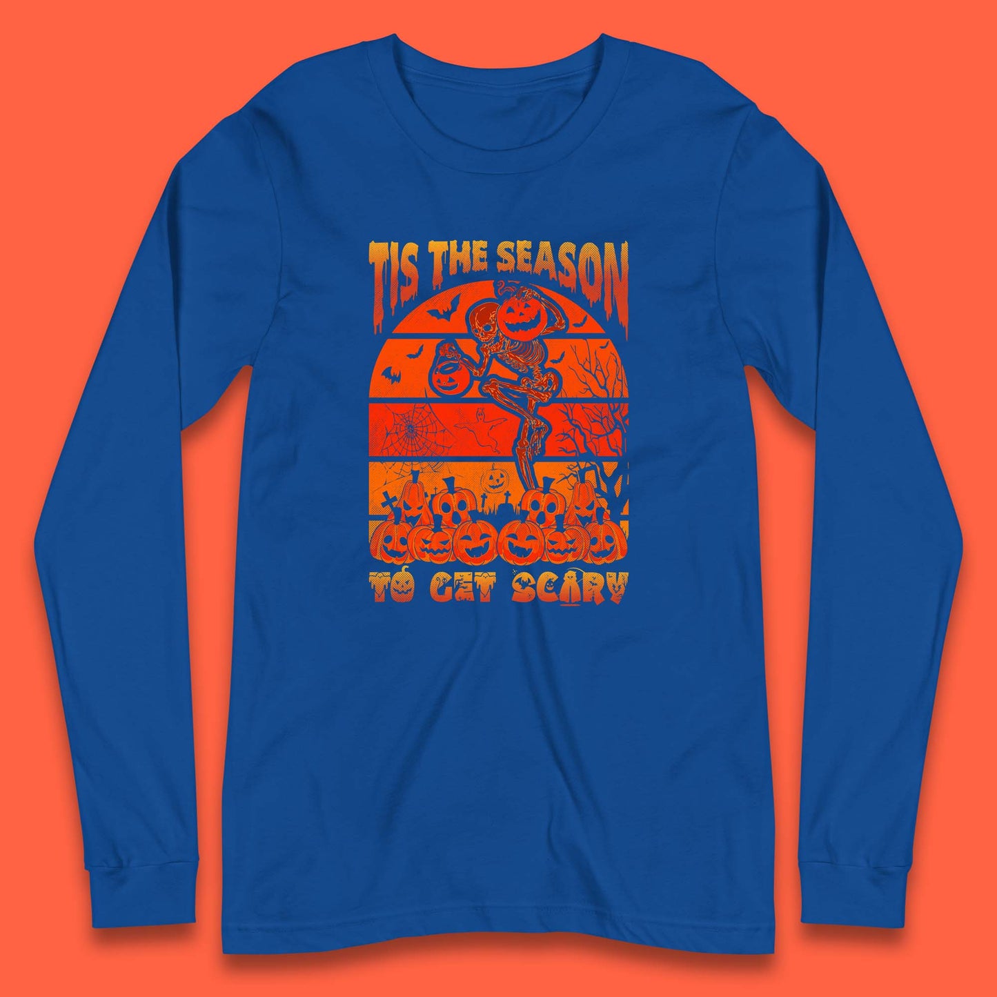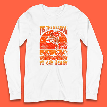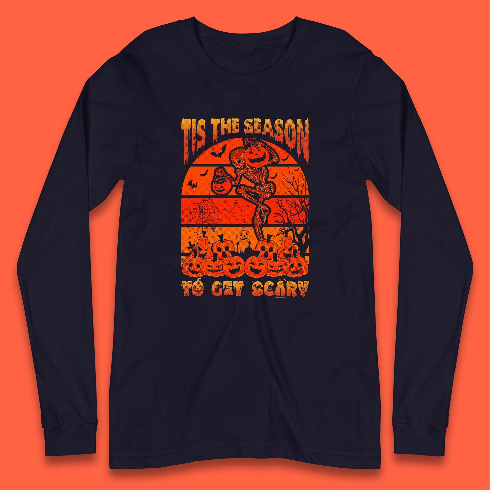 Tis The Season To Get Scary Halloween Skeleton Holding Pumpkin Buckets Spooky Vibes Long Sleeve T Shirt
