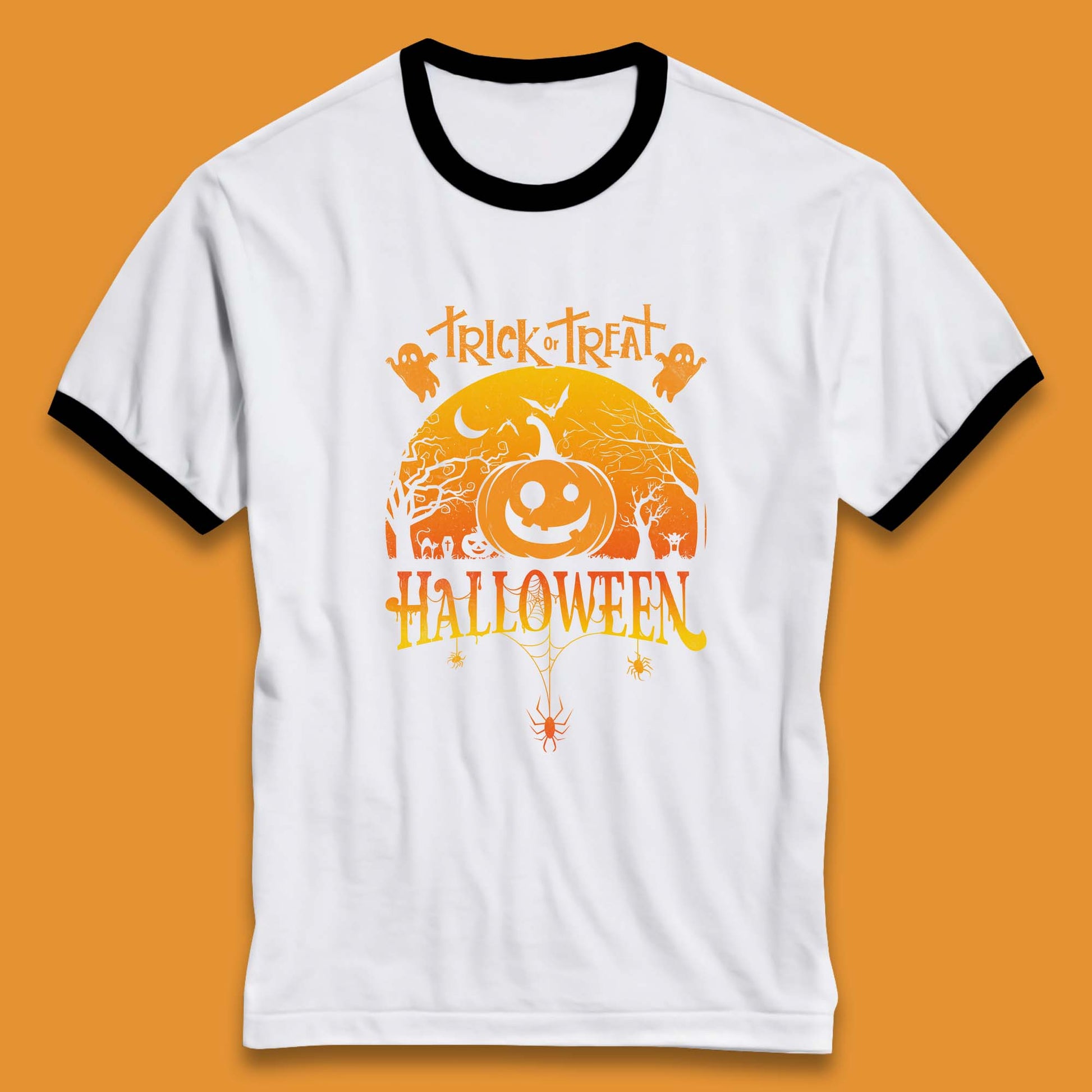 Trick Or Treat Halloween Pumpkin Haunted Trees Scary Spooky Season Ringer T Shirt