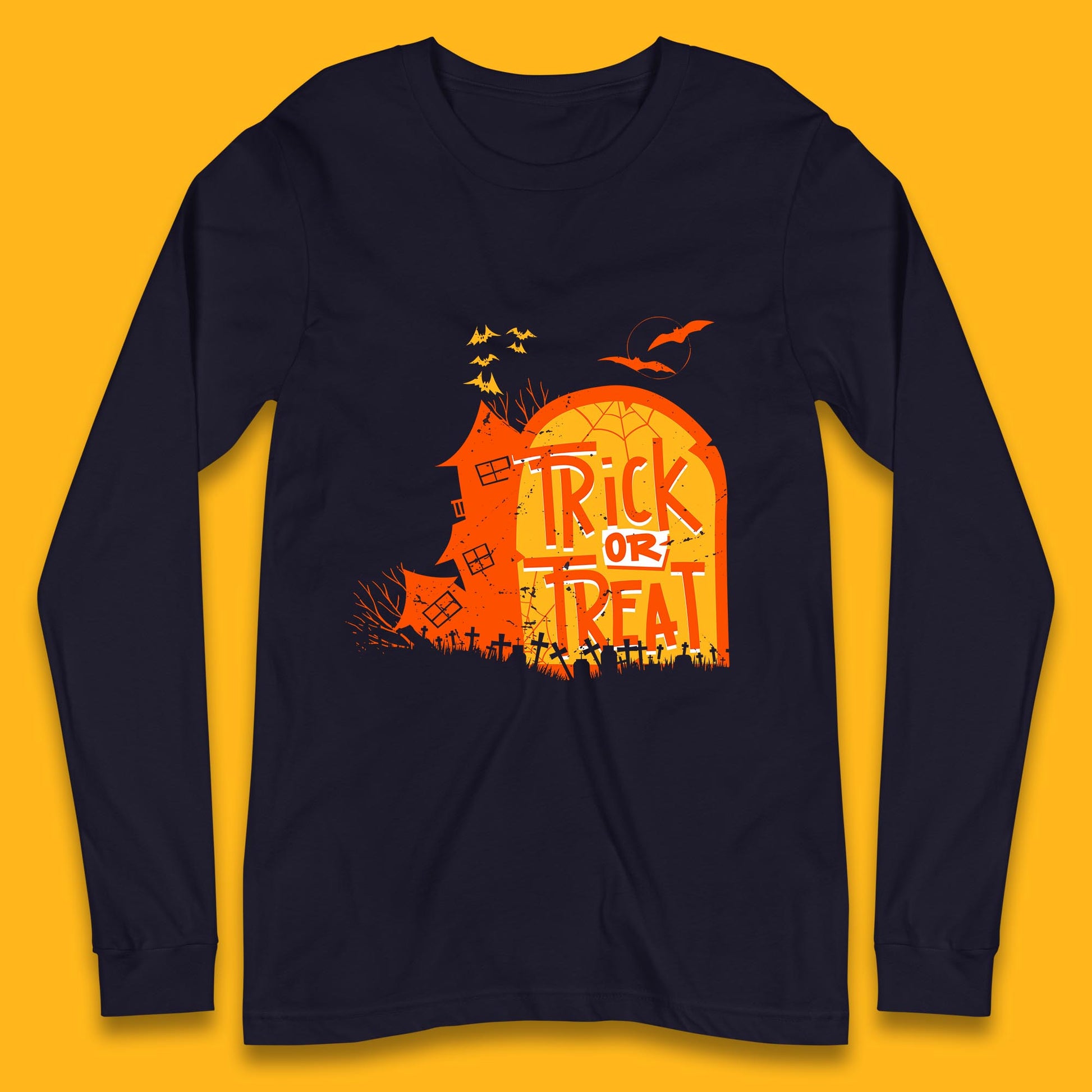 Trick Or Treat Halloween Terrific Abandoned Haunted House Flying Bats Long Sleeve T Shirt