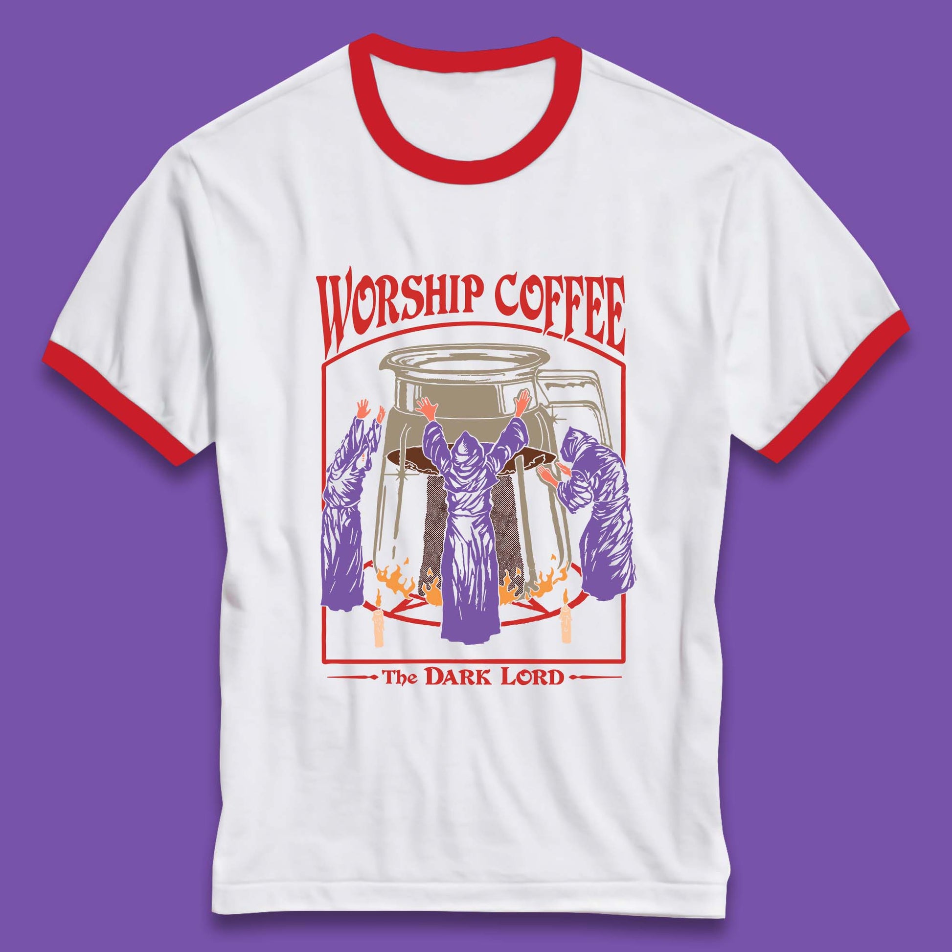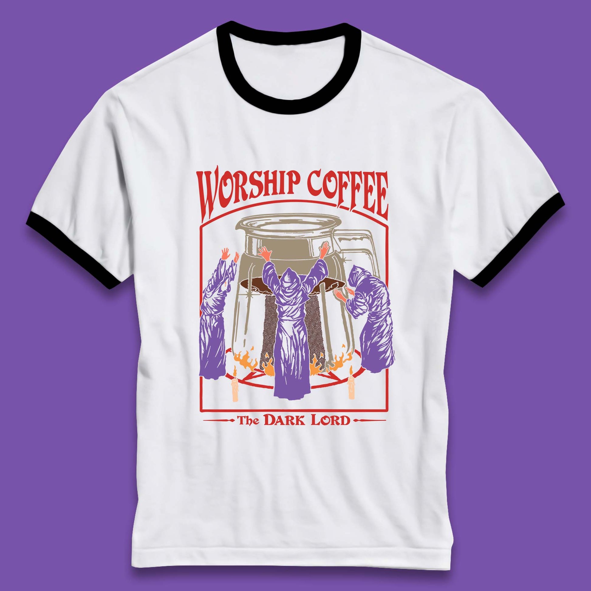 Worship Coffee The Dark Lord Aesthetic Vintage Coffee Retro Halloween Coffee Lover Faith Ringer T Shirt